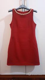 Abito sfiancato, in figura con rifinitura a catena sul collo, smanicato, adatto primavera/autunno, lunghezza sotto ginocchio,