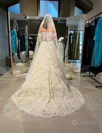 Vendo abito da sposa CATERINA Alberto Palatchi collezione 2025 come nuovo . Abito in pizzo avorio con motivo floreale , corpetto steccato con cinturino in vita verde in raso ( possibile scucirlo e metterlo bianco ) , gonna ampia con coda elegante . Completano l’abito maniche in pizzo e velo in tulle.
