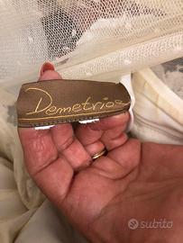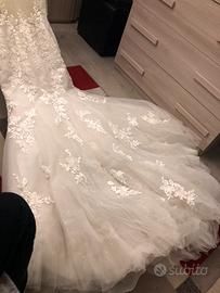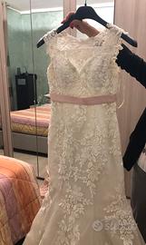 Elegante abito da sposa indossato una sola volta (provvista di custodia) con dettagli in pizzo floreale e una delicata cintura rosa. Taglia M (Senza etichetta). Lungo c.a. 1 metro e 70 cm. (Incluso strascico). Zip laterale, Corpetto con scollo a V e maniche corte in pizzo (omaggio cuscino anelli) Gonna a sirena con applicazioni di pizzo e perline - Tessuto in tulle e pizzo.