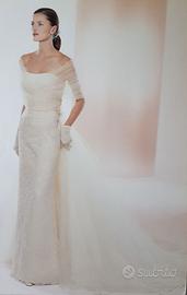 Color panna/avorio, taglia 42/44 pari al nuovo, formato da 2 vestiti, quello sotto in raso e quello sopra in merletto, compreso di cuscino porta fedi, guanti arrivano ai gomiti , velo, coda lunga e custodia porta abiti. Prezzo Trattabile. se avete bisogno di altre foto chiedete
