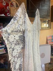 Modello a farfalla con scollo importante avanti e dietro; spacco frontale. Morbido e leggero di pizzo Francese