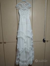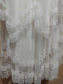 Abito da Sposa MAI USATO...tg.42\44 in tulle e pizzo macramè lavorato artigianalmente a mano con busto interamente secorato e lavorato con svarosvski...la schiena è seminuda e s'intravede sotto la lavorazione di pizzo...l'effetto è bellissimo...lostrascico è lì go 1 metro mentre il velo di tulle è lungo 5 metri...in abbinamento le décolleté nuove anch' esse ancora nella loro scatola originale con carta n° 37...made in Italia...di raso color avorio e vero cuoio italiano...anche il vestito è nel suo sacco orinale con cerniera... l' atelier del vestito è : Le Spose di Claudia (Montelupo Fiorentino) pagato €2300.