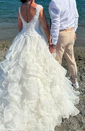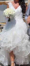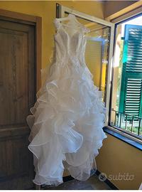 Vendo bellissimo abito da sposa bianco , come nuovo , indossato tre ore perfettamente lavato ed igenizzato in tintoria specializzata , tg 42 facilmente modificabile attraverso laccetto dietro la schiena . Regalo cuscino fedi nuovo ancora nel pacchetto…prezzo trattabile