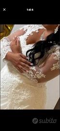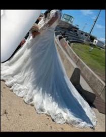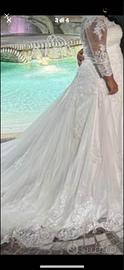 In perfette condizioni già portato in lavanderia. In piu sta i sottogonna fatto di raso e tulle x renderlo ancora piu ampio e camminare molto piu facile . E velo con calata da 5 mt