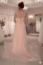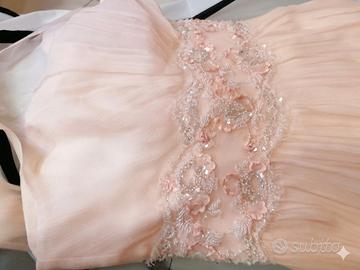 Vendo Abito Sposa nuovo mai indossato per la cerimonia! Usato solo per shooting fotografico. Rosa tenue, tg 44, in chiffon rigato con fascia in pizzo ricamato con perline ed piccoli inserti come da foto del particolare, spalle con fiocchi regolabili, dietro con fascia da annodare e fiori rosa, leggera coda nell abito rende la sposa più slanciata. Se chi compra é nelle vicinanze di Verona possibilità di modifiche su misura a parte dal costo. Consegnato con sacca protettiva. Se vicino a Verona consegna a domicilio