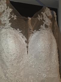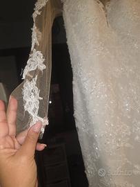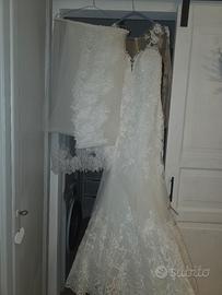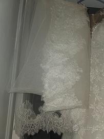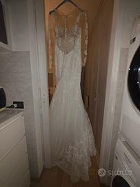 Vendo stupendo abito da sposa Pronovias di 5 anni fa, tenuto maniacalmente, appena lavato in lavanderia quindi pronto per essere indossato. È un sirena ma non troppo stretto al fondo, in pizzo romantico con abbinato un velo a clip molto lungo sempre pronovias. Manica a tatuaggio, scollo a V, schiena con bottoni in veri swarosky. Veste da una 40/42 a una 44 massimo. È veramente bello, un vero affare. Pagato da listino 3400€ lo vendo a 1500€ con il velo in regalo (solo il velo pagato 200€)