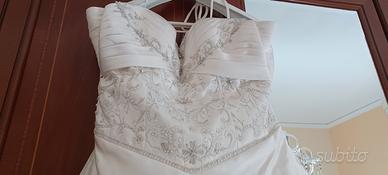 Vendo per conto di un amica,abito da sposa. L abito si presenta in perfette condizioni, lavato e sterilizzato presso lavanderia. L'abito è un Demetrios, in mikado di seta,impreziosito da perline, ricami e swaroski come si vede dalle foto. La coda anch essa lavorata e semirimovibile....Velo doppio anch esso lavorato con pizzo perline e filo d argento....L'abito è Completo del proprio sottogonna, guanti corti e coprispalle velato tubolare.
