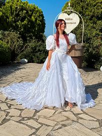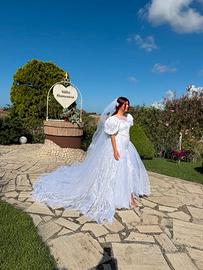 Abito da sposa bianco, realizzazione sartoriale in pizzo , forma tubino dove il corpino e le maniche a palloncino sono impreziosite con cristalli Swarovski, abbellito da un ampia gonna a strascico con effetto a onde; completo di velo lungo liscio con relativo ferma capelli. Portato in lavanderia appena dopo il matrimonio. Taglia: Small Misure della sposa: altezza con tacchi 167 cm.
