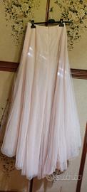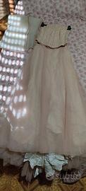 Abito da sposa color rosa con velo e corpetto ricamato.