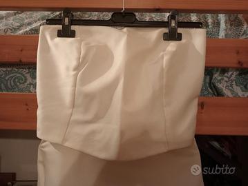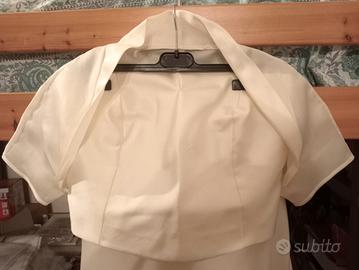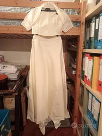 Lunga gonna a vita alta con cerniera e leggero strascico, corpetto con cerniera posteriore no spalline no coppe preformate, coprispalle leggero a maniche corte.