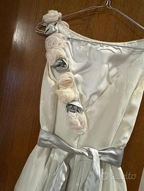 È un modello molto particolare e intramontabile, dallo stile minimal-chic e raffinato, con dettagli floreali sul corpino e cintura in raso grigio/perla che valorizza il punto vita.