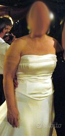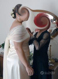 Splendido abito da sposa sartoriale in pura seta, disegnato e cucito su misura, quindi pezzo originale. Tre pezzi. Gonna svasata, corpetto rifinito con perline e bottoncini e velo in tulle. Taglia 50/52. Possibilità di adeguare la taglia.