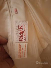 Descrizione Favoloso abito da sposa intero della collezione di EDDY K. con strascico. Colore latte. Bustino con scollatura impreziosita, sia davanti sia dietro da ricami platino, perline e strass; sottogonna originale. Lo strascico è tutto lavorato come visibile dalle foto. Sono compresi le calze autoreggenti; il coprispalle; il velo (corto davanti e lunghissimo dietro) rifinito con un fine ed elegante bordino in seta; i guanti (dello stesso colore dell'abito e arricchiti con perline); l'accessorio capelli (coroncina molto luminosa e tempestata di strass), questi ultimi due, nelle rispettive scatole originali.