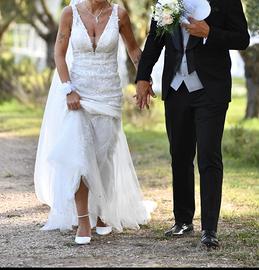 Vendo abito sirena Pronovias mod MANSFIELD 2022/23 utilizzato a luglio 2023 lavato e riposto in perfette condizioni nel suo porta abiti, meraviglioso modello a sirena, con ricami in pizzo lucenti, scollatura davanti a V con leggero inserto di velo, effetto vedo non vedo, scollatura dietro, spalline rifinite con ricamo, coda non troppo lunga, misura 40, io sono alta 1.75, con possibilità di essere allargato o ristretto. L'abito non è trasparente, nelle foto della modella sono senza fodera interna, per far vedere il ricamo del tessuto, davvero bello e ben rifinito. Possibile acquistare anche il velo abbinato.