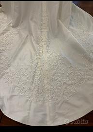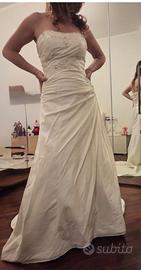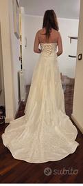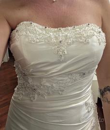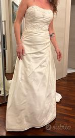 Vendo bellissimo e raffinato abito da sposa color avorio acquistato in atelier a Genova per 1400 euro, indossato solo per la cerimonia e tenuto con cura Eleganti decori di luce zona corpetto e sullo strascico, modello che definisce le linee del corpo e dei fianchi, sulla schiena lacci che possono stringere o allargare un po' l abito taglia 42/44. Insieme all'abito c'è un leggero velo corto che arricchisce il tutto