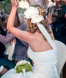 2 fiori coordinati per acconciatura, parte dell'abito e realizzati nello stesso tessuto, con due bande lunghe che scendono morbide lungo il retro dell’abito.
