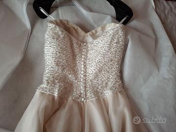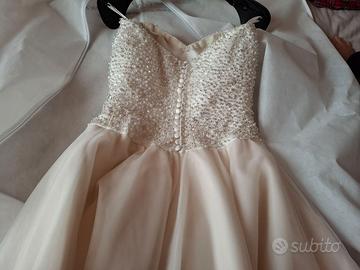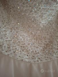 Corpetto luminosissimi con perline e chiusura dietro con cerniera e finti bottoncini. Leggermente imbottito il seno. Gonna rosa cipria in morbido chiffon. Lavato in lavanderia e disponibile leggero coprispalle in chiffon