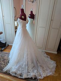 abito sposa usato marca Pronovias Barcellona, pizzo chantilly e strass, con coprispalle in tulle, taglia 42.