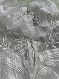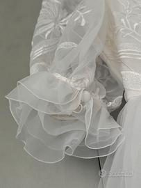 Abito da sposa di pregio, colore bianco, tessuto in voile, seta, tulle, con fiori in rilievo e strascico lunghezza media acquistato in Boutique Abiti da sposa. Misure e descrizione abito: 1° strato interno con tulle e balze, raddoppiate sul fondo per dare volume e ricchezza, larghezza sul fondo cm. 180, altezza balza doppia in tulle cm. 42. Largh. abito in cintura vita, cm. 38, largh. spalle cm. 40. Larghezza da una ascella all'altra cm. 49, collo con doppia balzina morbida e molto elegante, chiusura abito sul retro con lampo e gancio, lunghezza maniche al gomito cm. 43, altezza abito sul davanti cm. 160, altezza dietro con strascico tessuto in seta cm. 195. Le maniche sono arricciate all'attacco delle spalle ed in fondo hanno doppia balzina e chiudono con due bottoncini in seta bianca come da immagini - 2° strato di seta coprente con strascico - 3° strato di tulle molto arricciato senza balze - 4° strato tessuto con fiori in rilievo molto delicati. Abito bellissimo, anzi stupendo. Taglia 42. Prego verificare con misure specificate. Usato una volta e consegnato alla Boutique abiti da sposa che ha effettuato il lavaggio a secco, tenuto con molta cura, confezionato con il suo sacco originale. E' un abito molto raffinato e di ottima Sartoria.