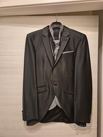 taglia media. set completo con abito (giacca e pantalone) e panciotto con cravattino a contrasto.
