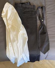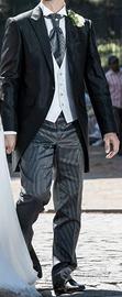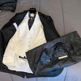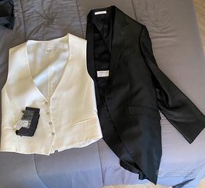 Abito da sposo tight, l'abito formale per eccellenza per le cerimonie diurne. Composto da pantalone taglia 50, camicia bianca (taglia 41/16), gilet bianco taglia 50, cravatta e giacca nera taglia 50. Usato solo una volta al mio matrimonio, la camicia si è ingiallita non saprei se può tornare bianca. Sacca porta abito originale. Non spedisco.