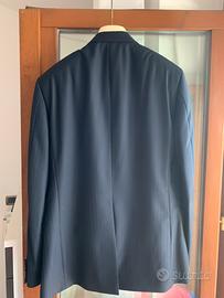 Abito blu notte con microriga tono su tono, taglia 48. Giacca monobottone, Panciotto grigio argento e pantalone con pieghe allungabili.