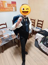 Abito uomo da sposo, giacca e crabattino combinati Il completo comprende: -giacca come da foto (nero/blu) -gilet con ritocchi interni con elastico per adattare alla forma del corpo (nero) -pantaloni anche questi accorcciati x la altezza, lavoro facilmente da smontare in quanto non é stato tagliato il tessuto (nero) -crabattino intonato alla giacca -gemelli in omaggio Abito mai usato, solo per dimostrazione foto Le misure in qutione pantalone tg 48 L' uomo che lo indossa 80 kg x 183 h Ritiro anche presso il mio domicilio