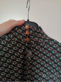 Abito stile vintage anni 60,made in Italy, tg. S,con bottoncini dorati sul collo, 95% viscosa 5% elastane, fantasia su fondo marrone caffè.Il colletto può essere portato alto con i bottoni chiusi o aperto e tirato giù. Cintura NON compresa.L'abito è stato portato una sola volta, essendo elasticizzato veste molto bene,stoffa fresca.