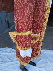 - Tessuto pregiato in broccato rosso e oro.