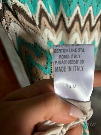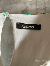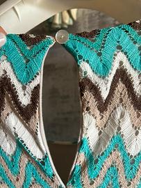 Bellissimo abito smanicato del brand italiano Talco, caratterizzato da una raffinata lavorazione in pizzo crochet con l’iconica fantasia a zig-zag (stile Missoni). Il vestito gioca su una palette di colori fresca ed estiva che alterna il turchese, il marrone cioccolato, il panna e il sabbia. Presenta uno scollo tondo sul davanti e una delicata apertura a goccia sul retro, chiusa da un bottoncino trasparente. Il capo è interamente foderato per evitare trasparenze e garantire una vestibilità perfetta. Si tratta di un prodotto Made in Italy distribuito da Berton Line SRL, sinonimo di ottima fattura. La taglia riportata è una M e le condizioni sono eccellenti, pari al nuovo. Ideale per un aperitivo estivo o una cerimonia informale se abbinato a un sandalo gioiello.