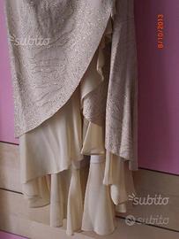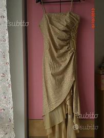 Abito elegante, tg 44 : lungo con spalline , parte davanti interna con coppe, parte laterale sinistra trasparente , cerniera dietro,spacco con balze di veli a sinistra , paillettes e ricami dorati,