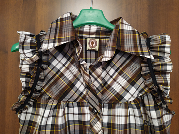 Abito tartan sui toni di bianco, nero e marrone con cagnolino in panno nero applicato.