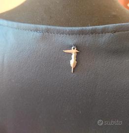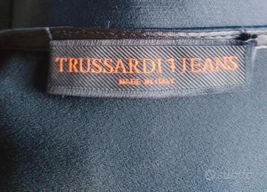 Abito di Trussardi Jeans molto versatile color3 blu scuro scende morbido stringendosi verwo l'orlo. Tg M misure spalle raglan approssimativamente 45 cm, circonferenza torace 114 cm lunghezza 96 cm.