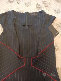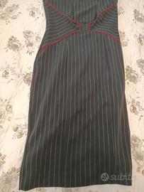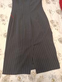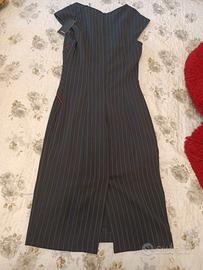 Abito tubino gessato blu con sottili decorazioni rosse sul punto vita.