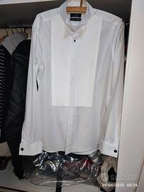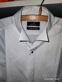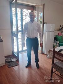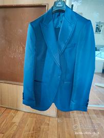 Abito da cerimonia blu taglia 50 con camicia bianca da cerimonia misura 41 di collo che corrisponde a una L, papillon,pochette bianca,e cinta blu lucida,tutto Barbuti.Il tutto indossato una volta soltanto,pari al nuovo.