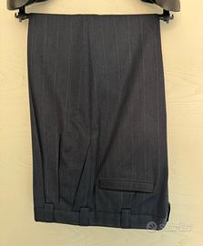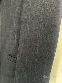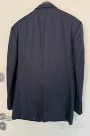 Bellissimo abito uomo originale Gianni Versace. Completo giacca e pantaloni. Colore blu scuro gessato, lana pettinata, manifattura Italia. Pantaloni: lunghezza gamba 106, bacino 45, larghezza gamba 28. Giacca: lunghezza manica 62, spalle 50. Usato pochissime volte, splendide condizioni.