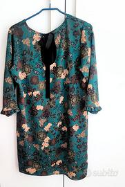Abito verde bosco con motivi floreali nei toni del marrone, beige e verde. Modello a tunichetta, scollo tondo sul retro chiuso da nastrino in velluto, manica 3/4 con piccola ruche.
