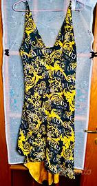 Abito originale Versace Jeans Couture, modello con iconica stampa barocca nero e oro.