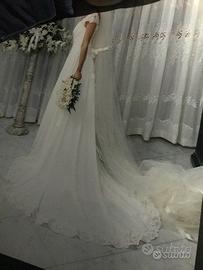 vestito da sposa, taglia 42/44, colore avorio e bianco, contenuto nella sua sacca originale, completo di cuscino per fedi e guanti.
