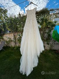 Abito da sposa marca Pronovias modello LEONIE B.NAT TUL&ENC&PED di qualche anno fa, fuori produzione ormai. Tenuto molto bene e davvero bello. Con coda posteriore nè troppo lunga nè troppo corta. Lavato professionalmente e tenuto e riposto con cura in due custodie morbide. Sulla sottoveste(invisibili esternamente) sono rimaste due macchie ostinate, che cito per correttezza. Taglia 38. Chiusura posteriore a zip. Presenti glitzer di ricambio originali. Ho molte piu foto in galleria, quindi basta scrivermi e ve le mando su subito o via telefono, qui mi è permesso metterne solo 6.