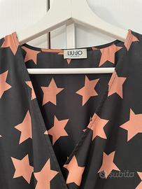 Abito Liu Jo stampa stelle rosa su sfondo nero, tessuto leggermente lucido, incrociato sulla scollatura, elastico a segnare il punto vita.