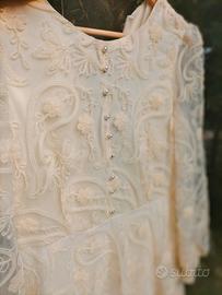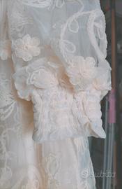 bellissimo e particolare abito vintage. materiale sintetico effetto pizzo con ricami su tutta la stoffa, bottoncini sul davanti, cerniera sulla schiena, polsini arricciati, sottogonna più strato di tulle. Color crema. taglia L. È in ottime condizioni