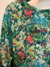 La fantasia di fiorellini molto delicati ed i colori vivaci ricordano i quadri dell'impressionismo. Scollo a barca molto pronunciato. Il tessuto è leggermente elasticizzato