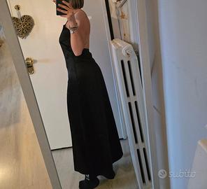 Vestito lungo in raso con bretelle sottili, scollo a cuore , cerniera laterale, con schiena da fuori, scollato.