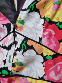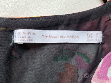 Abito Zara a fantasia fiorita, maniche corte, modello corto con corpetto aderente e gonna svasata. Scollo con bottoncini (apribili). Chiusura laterale con cerniera e dietro al collo con bottone. Foderato. Indossato una volta. Lunghezza cm 88, larghezza seno cm 43, larghezza vita cm 36, spalle cm