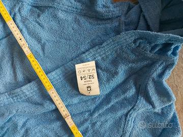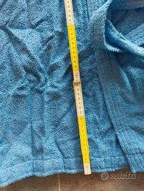 Accappatoio lungo, colore azzurro acceso, ottima spugna di cotone marca Bassetti, taglia 52/ 54 (misure al centimetro in foto). Cappuccio, due tasche applicate, cintura. Nuovo. Euro 40. Ritiro o spedizione a carico dell'acquirente.