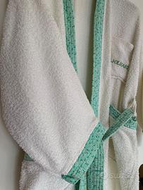 Accappatoio vintage anni '80 di Naj Oleari, bianco di cotone con profilo con il motivo tipico del brand. Veste taglia Small e taglia Media.