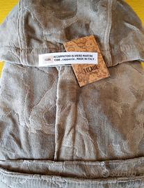 Nuovo originale , Prodotto di eccellente qualità e manifattura realizzato in spugna operata jacquard 100% cotone . Lavorazione velour e ricciolo bouclè ; accappatoio con cappuccio tasche a toppa e cintura . Veste una persona alta cm. 170/185 peso 70/95 kg. Lunghezza sotto il ginocchio .