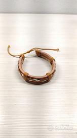 Foto 3: Bracciale in cuoio, nodi scorrevoli in tessuto e inserti metallici circolari, ricevuto estate 2025 proviene da Gran Canaria, non possiedo scontrino e contenitore,non è mai stato indossato. Non conosco l' origine del cuoio e i nodi scorrono in maniera fluida. 3€.