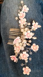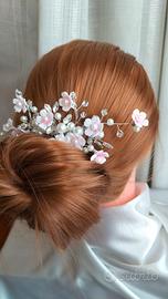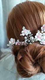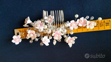 Pettine con piccoli fiori di pesco in porcellana fredda. Ogni fiore ha al centro una perlina. Completano l'accessorio :perle grandi medie e piccole, cristalli incolore e strass argento. Creo oggetti artigianali italiani, non troverete oggetti uguali
